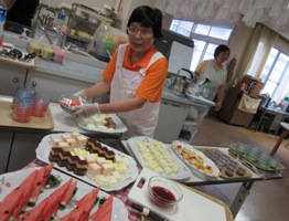「夏のデザートバイキング」ということで、「アイス、すいか、桃、ケーキ、水ようかん、抹茶プリン・・・等」冷たいデザートを沢山用意しました。