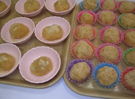 もち米、うるち米、ゼラチンを加えて作った物と、ミンチ食の方でも食べれるようにお粥をゼラチンで固めて作った物(ピンクの器)の2種類を作りました。