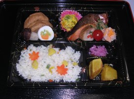 「栗ごはん、鮭の照焼、パンプキンサラダ、煮物盛り合わせ、大学芋、豚汁」