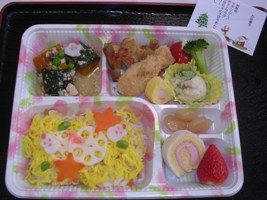 ちらし寿司、鶏の照焼、エビフライ、ポテトサラダ、かぼちゃのそぼろあんかけ、ケーキ、いちご