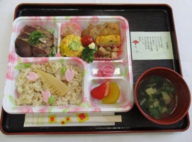 「筍ごはん、かつおのたたき、グリルチキン、パンプキンサラダ、山菜出し巻き、海老焼売、竹の子とふきの煮物、フルーツ、若竹汁」です。