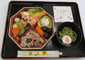 『赤飯、天ぷら、筑前煮、ゆずなます、季節のフルーツ、うさぎまんじゅう、茶そばすまし』 お品書きのカードを添えて。