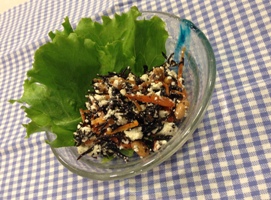 2、フライパンにサラダ油を熱し、人参を入れて炒め油がなじんだら大豆水煮、ひじきを加え炒め合わせる。