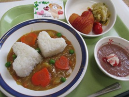 今日のお昼は『ハートのカレー、ハートコロッケ、チョコババロア』とハートずくしメニューでした。