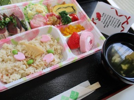本日のメニューは「竹の子ごはん、かつおのたたき、グリルチキン、卵焼き、桜色えび焼売、おいもサラダ、筍とふきの煮物、いちご、ケーキ、若竹汁」でした。