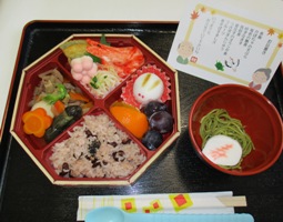 本日の献立は「赤飯、筑前煮、なすのオランダ煮、海老の艶煮、かぼちゃの天ぷら、ゆずなます、フルーツ、うさぎまんじゅう、茶そばすまし汁」でした。