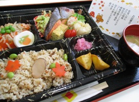「松茸ごはん、鮭の照焼、切干大根と大豆の煮物、枝豆サラダ、コーン焼売、柚子風味の卵焼き、なます、大学芋、豚汁」です。