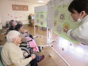 鬼の絵をホワイトボードに貼り、豆(ボール)を当てるゲームをしていただきました。