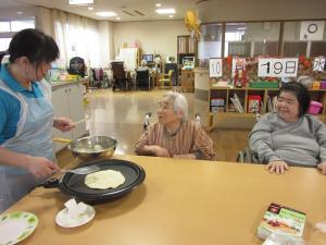 生地を混ぜたりする準備を入所者も手伝ってくださり、