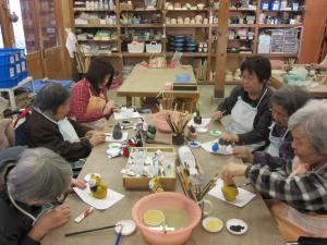 ご利用者も職員も言葉を忘れて真剣に絵筆を握っています。