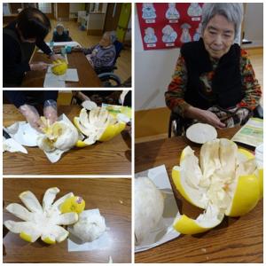 子どもの頭ぐらいある晩白柚を丁寧に包丁で皮をむき、中身を入居者の皆様で