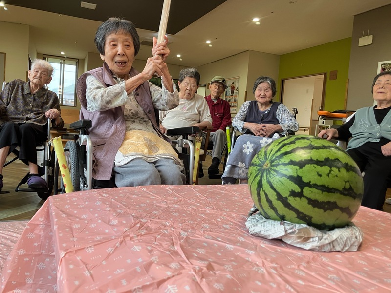 皆で掛け声を掛け合いながら、スイカ目掛け力いっぱい叩かれました。